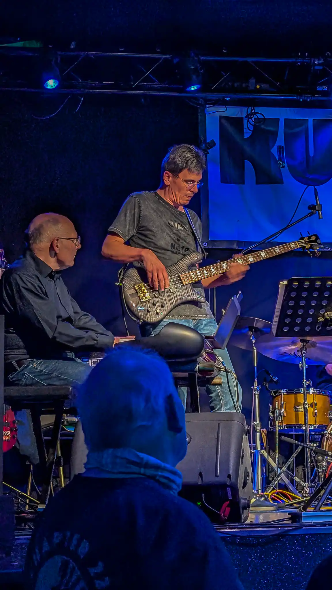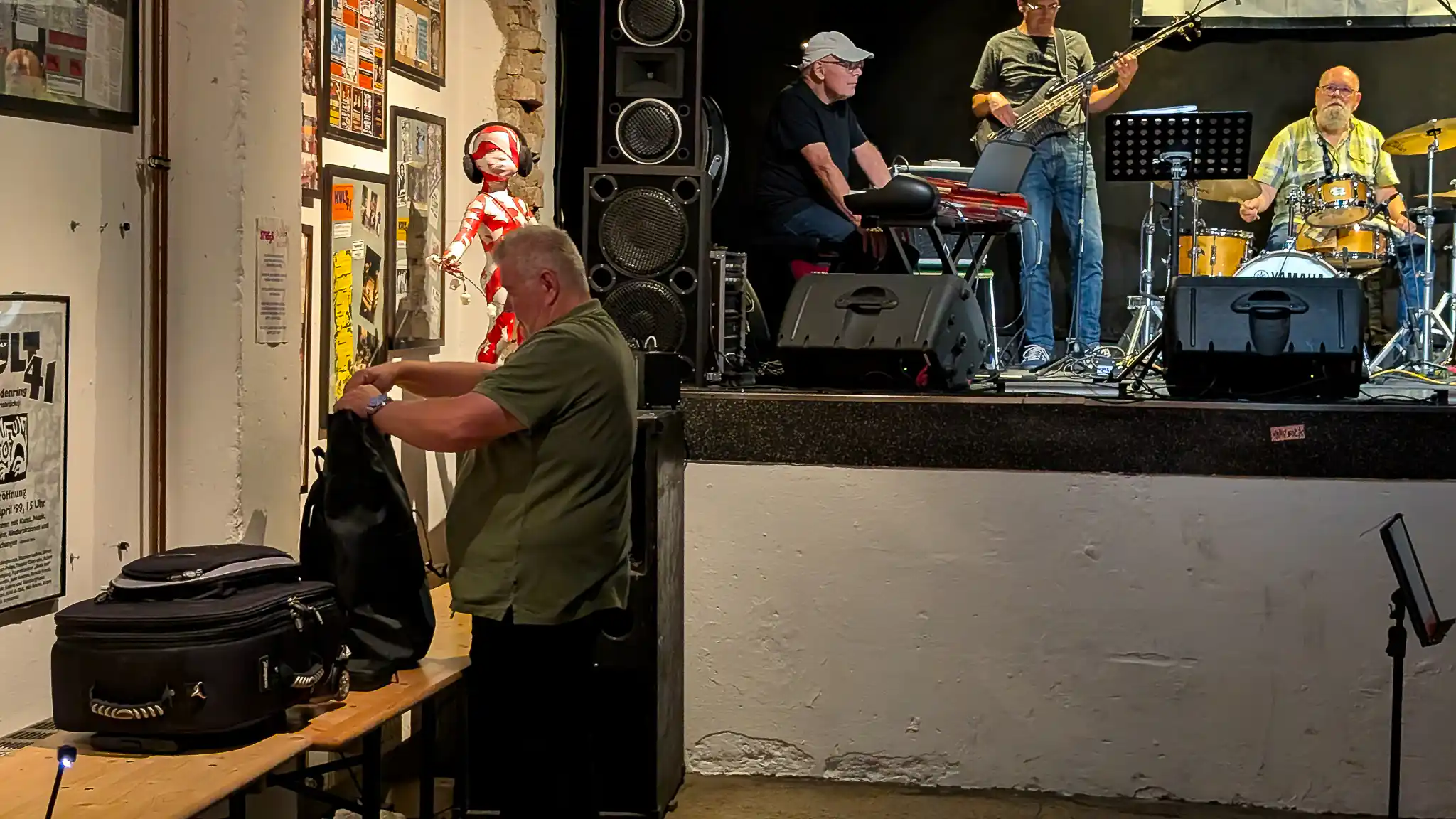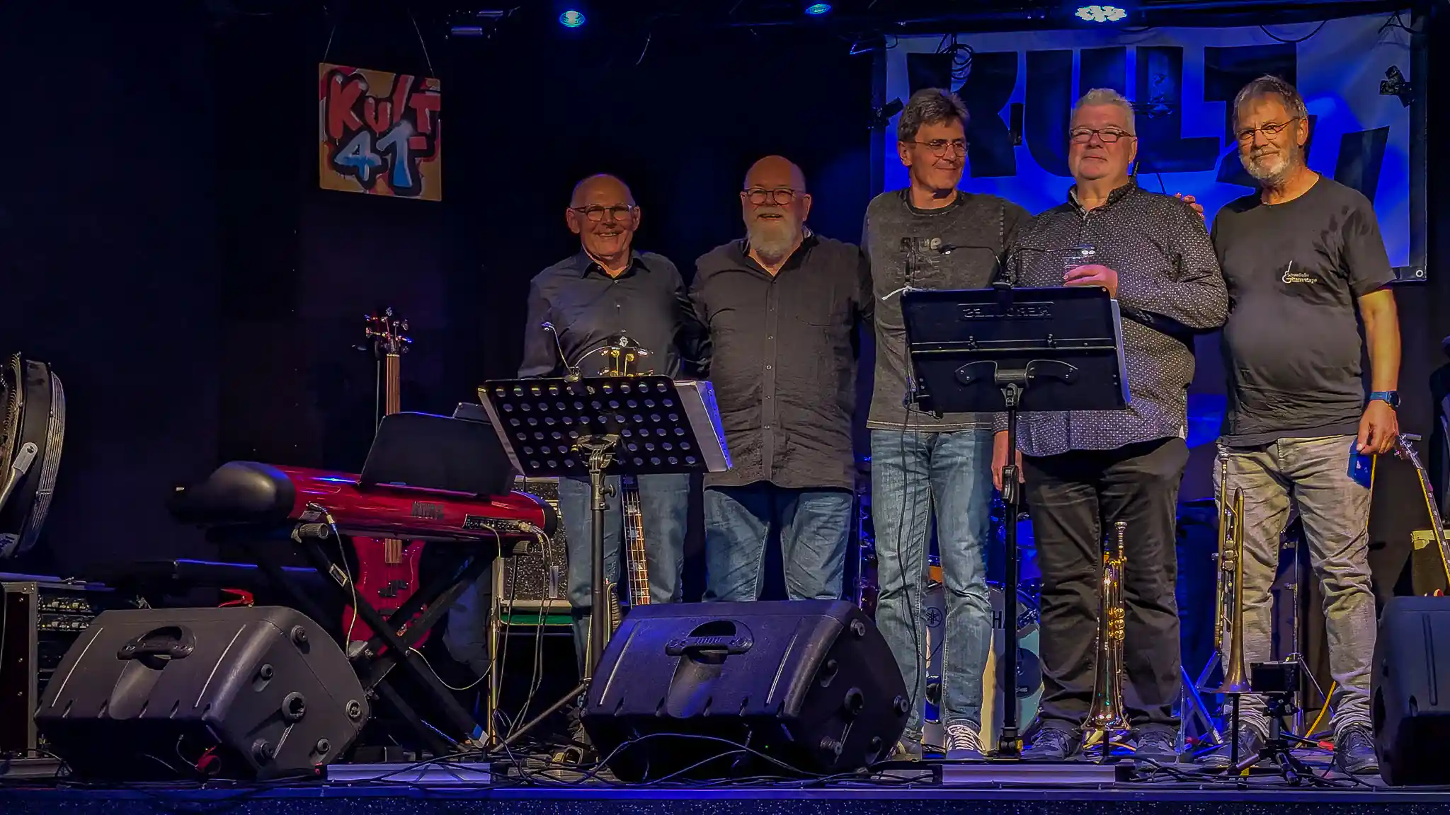 Es war eine Herausforderung, im Kult41 in Bonn zu spielen. Der Spielort mit über 200 Konzerten im Jahr(!) konzentriert sich eigentlich mehr auf Rock-, Punk- und Independent-Auftritte. Auch die Spielstätte, eine kleine Halle mit einer alten Laderampe als doch recht hoher Bühne hatte ihre akustischen Eigenheiten. Es gab einen herzlichen Empfang durch Uwe Sarter, der uns eingeladen hatte. Vor dem Konzert lud er uns erstmal Backstage zum Essen der selbstgebackenen Pizza ein. Der Soundcheck mit Wolfgang vom Kult41 hatte dann etwas Geduld abverlangt, doch beim Konzert klappte alles bestens. Das neue Programm der Band wartet neben den Swingnummern vermehrt mit erdigen Sounds aus Funk, Blues und Jazzrock auf. So legte Trompeter Rainer Matz mit Schlagzeuger Martin Christophery bei "St. Thomas" ein spektakuläres Frage-Antwortspiel hin, indem er mit seinem Mikro im "Beatbox"-Style improvisierte. Aber auch sonst gab es viele spontane Nuancen im Spiel und die den Jazzis stets eigene Spielfreude zeigte sich bei Peter Hünnemeyer in seinen virtuosen perligen Improvisationsläufen, Jörg Faust in kreativen Anschlagstechniken am Bass und Stefan Weigelt mit stets variablem Gitarrenspiel an Jazz- und Akustikgitarre wieder einmal in besonderer Weise. Der Funke sprang spätestens nach der Pause komplett über und umso schöner, dass die Jazzis die Leute zum Schluss bei den letzten vier Stücken des Konzertes sogar auf der Tanzfläche sehen konnten. Zwei Zugaben wurden noch abverlangt, bevor die ordnungsrechtliche Deadline den offiziellen Konzertabend beendete. Das Publikum und die Veranstalter konnten wir restlos begeistern und bekamen von allen Seiten positive Rückmeldungen. Eine mittelfristige Wiederholung ist fest vorgesehen. Wir bedanken uns bei Uwe für die Einladung, Wolfgang für den Sound und den netten Leuten am Einlass und an der Theke für den herzlichen Umgang und kommen natürlich gerne einmal wieder!