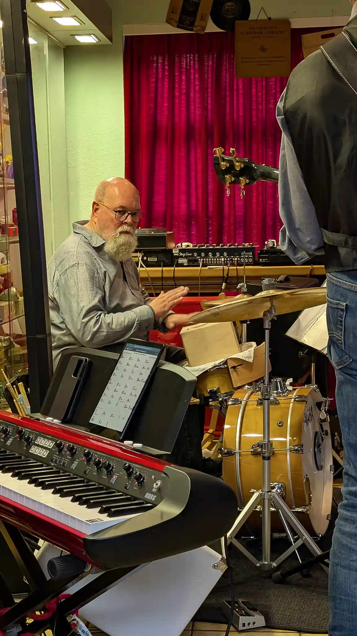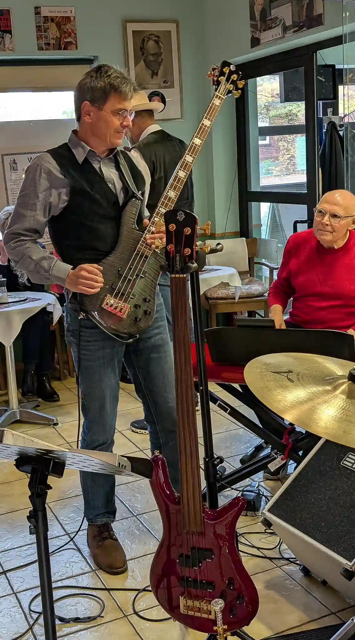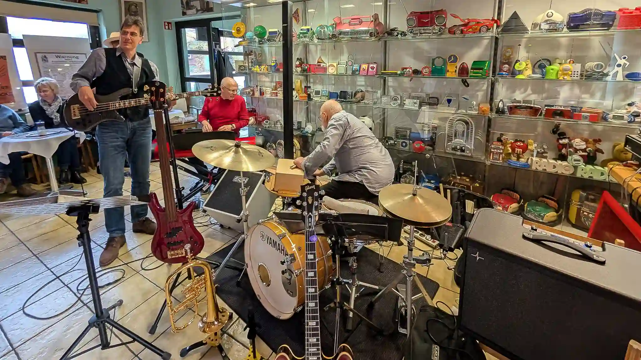 Wieder mal eine tolle location, welche inhaltlich sogar mit Musik und Jazz zu tun hatte. Auf Einladung von Volkmar Hess, der umtriebigen Seele des Museums spielten die Jazzis am Sonntagnachmittag vor einem begeisterten Publikum. Da einige Swingtänzer und -tänzerinnen anwesend waren, wurde auch kräftig das Tanzbein geschwungen. Die Band hatte dazu extra für dieses event die Setlist etwas swinglastiger gestaltet. Aber auch die moderneren Stücke wurden mit viel Beifall bedacht, so besonders Bali Run, einer unserer besonders herausfordernden Titel. Es gab lecker Kuchen zu essen und natürlich war die Kulisse beeindruckend. Volkmar führte uns vor dem Auftritt durch die Sammlungen und demonstrierte vor allem ausführlich die frühe Grammofontechnik. Weitere Highlights waren die Tonbandsammlung und natürlich der DJ-Arbeitsplatz von Chris Howland, selbst ein begnadeter Musiker, der Fernseher von Werner Höfer sowie das erste EV-Mischpult von BAP. Unser Gitarrist Stefan hatte im Techniker des Museums einen kompetenten Gesprächspartner, war er doch früher selbst Sammler und Restaurateur von alten Röhrenradios. Nach dem Konzert fand noch eine kleine Fotosession vor diversen interessanten Objekten statt. Danke an alle Beteiligten des Museums und gerne kommen wir nächstes Jahr wieder.