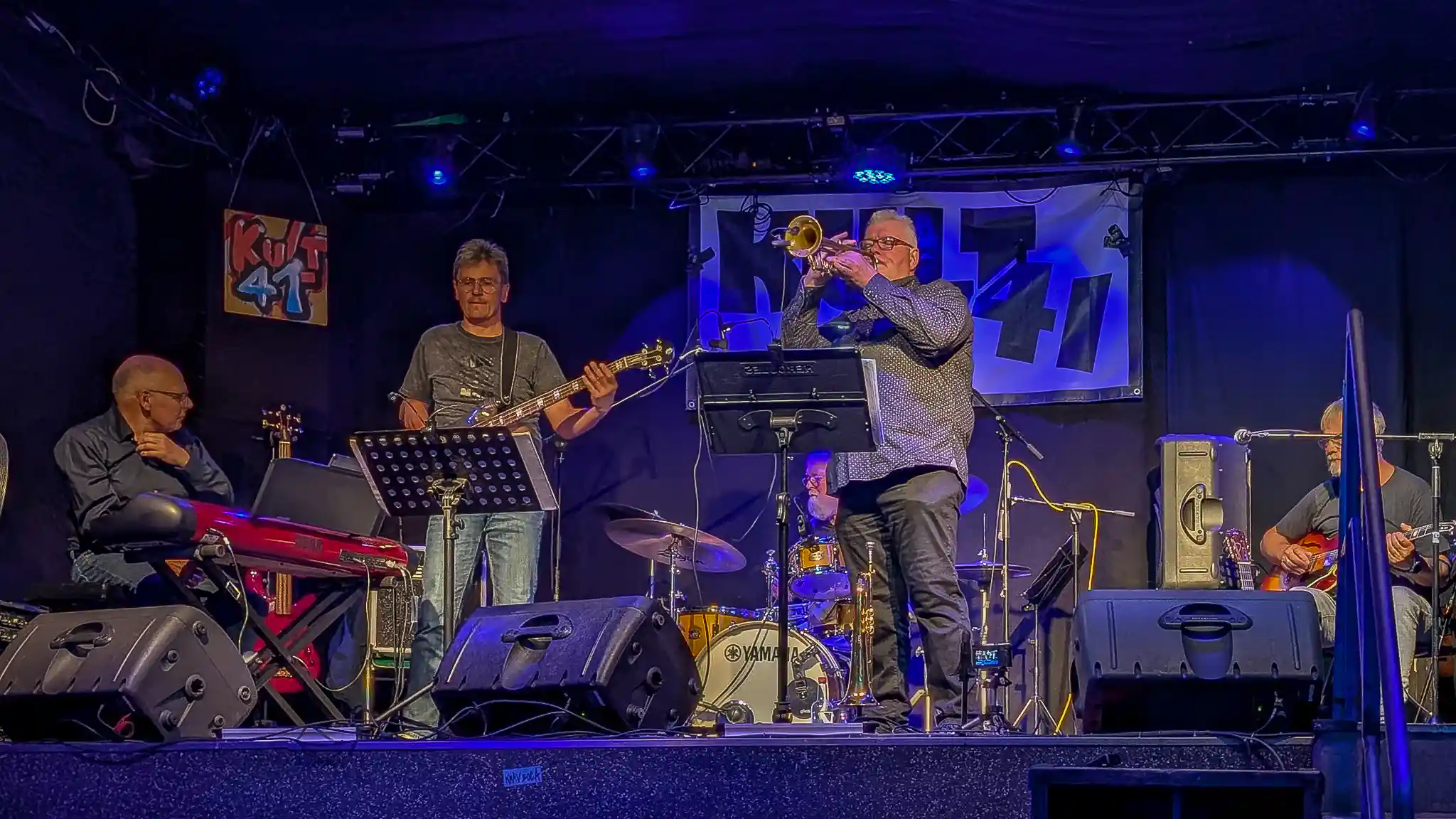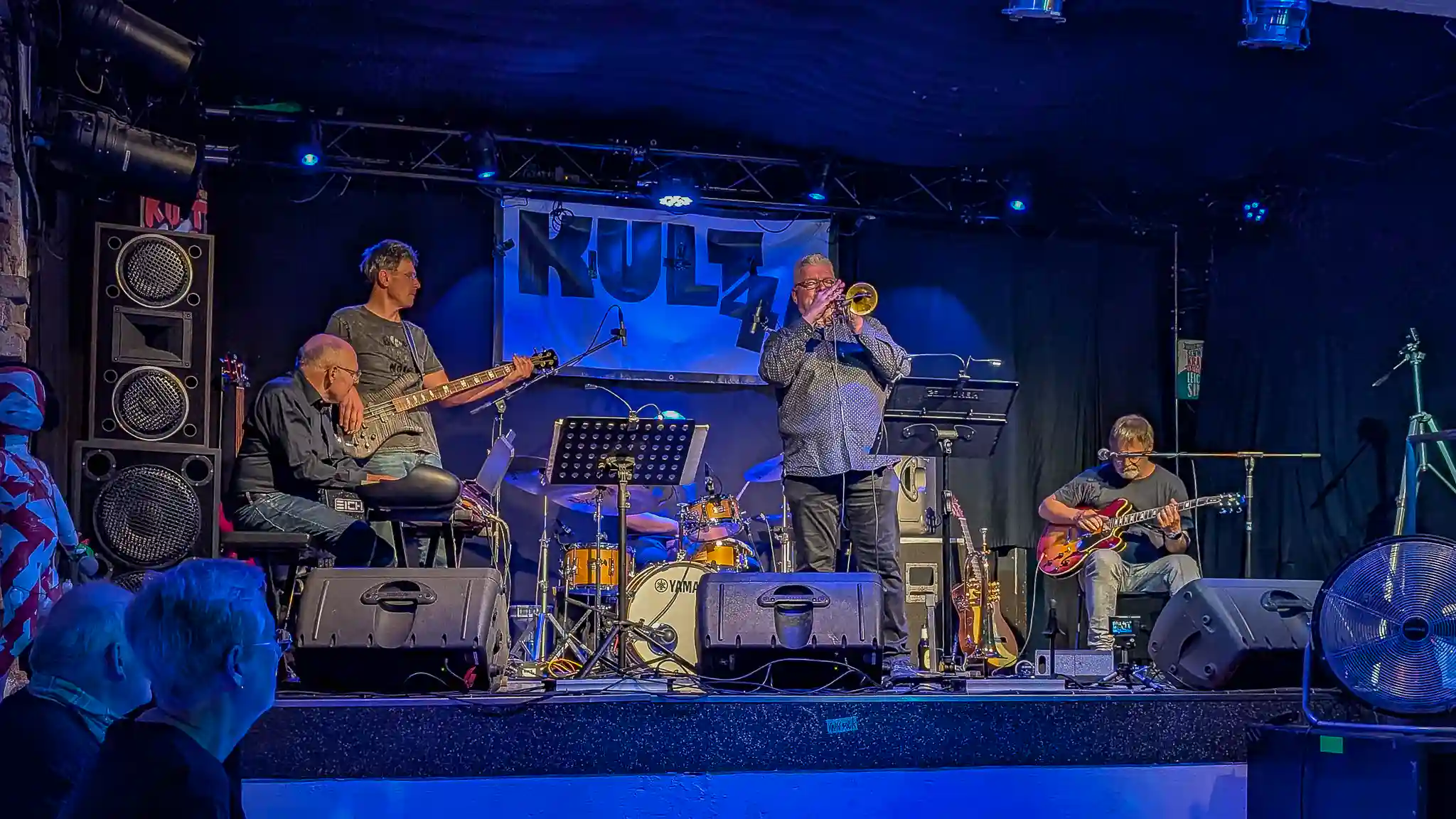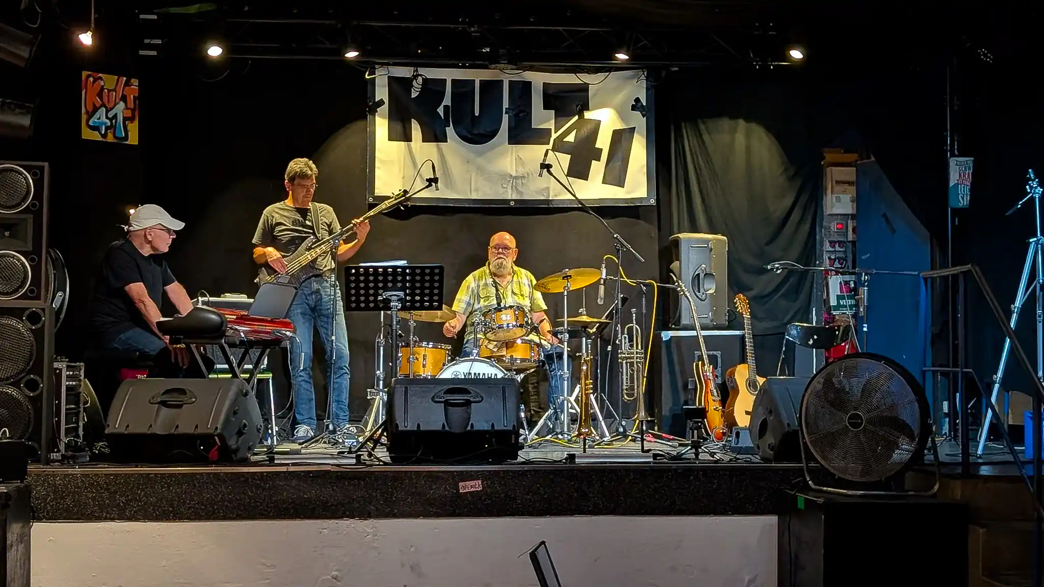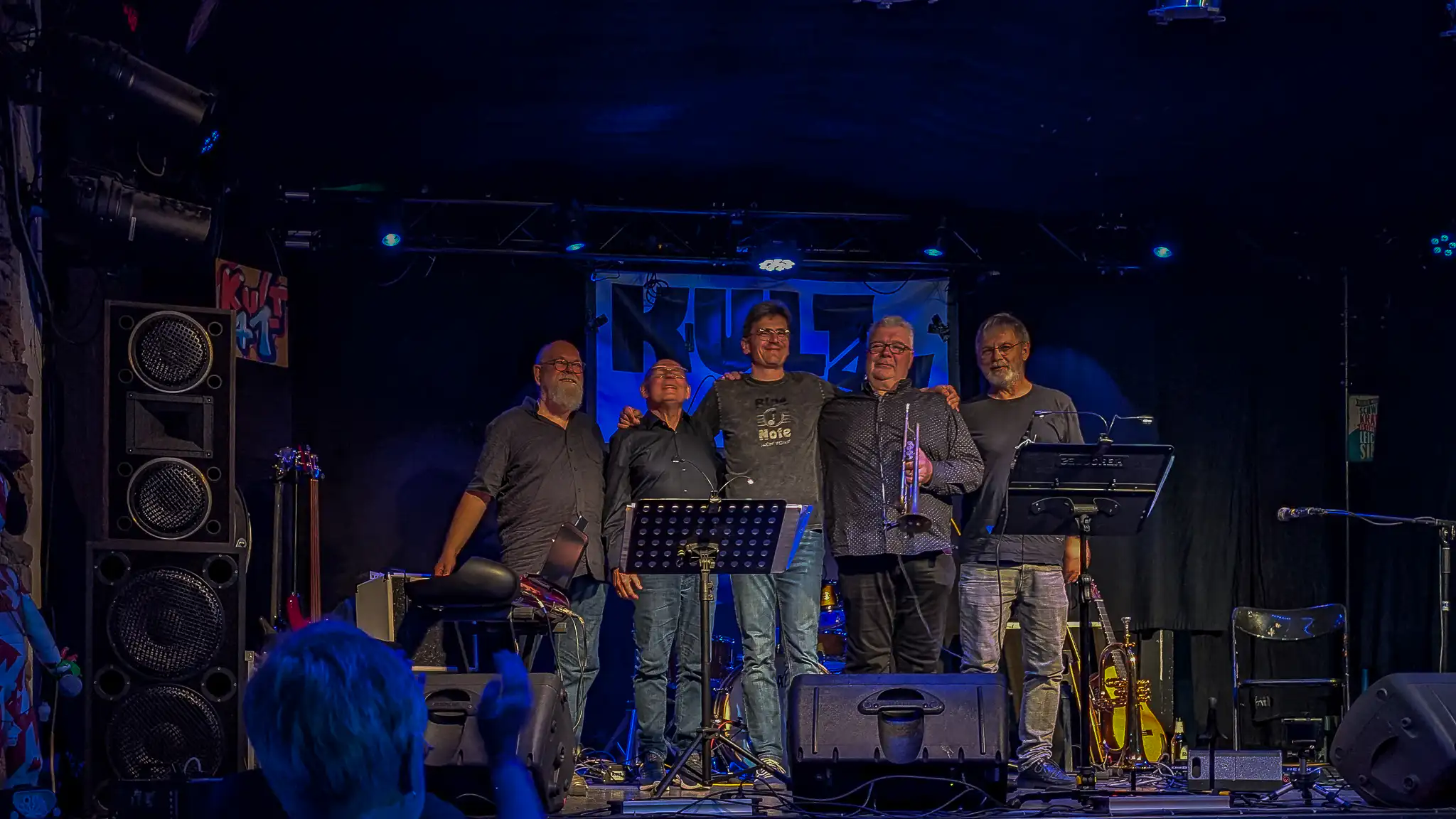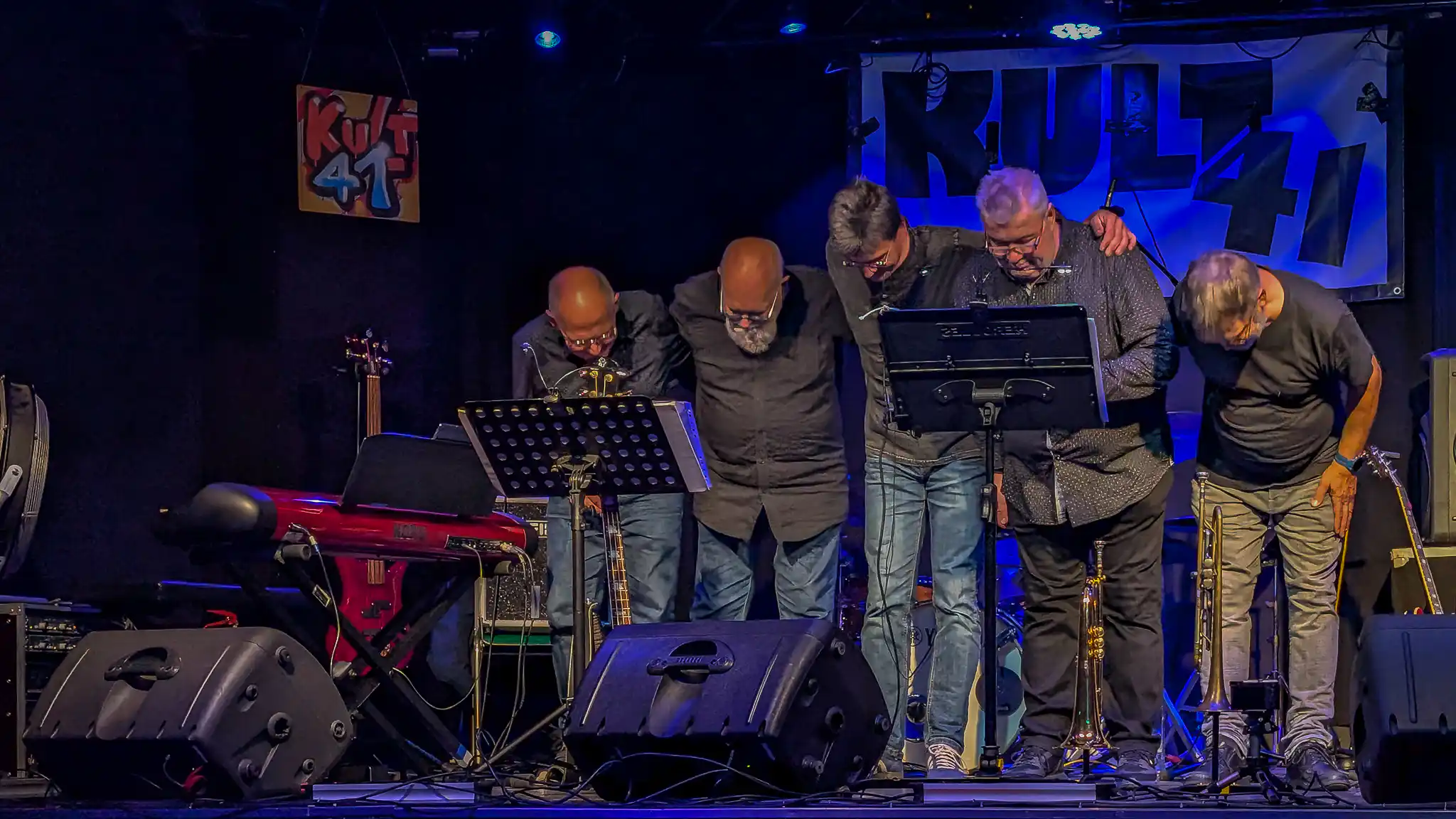 Es war eine Herausforderung, im Kult41 in Bonn zu spielen. Der Spielort mit über 200 Konzerten im Jahr(!) konzentriert sich eigentlich mehr auf Rock-, Punk- und Independent-Auftritte. Auch die Spielstätte, eine kleine Halle mit einer alten Laderampe als doch recht hoher Bühne hatte ihre akustischen Eigenheiten. Es gab einen herzlichen Empfang durch Uwe Sarter, der uns eingeladen hatte. Vor dem Konzert lud er uns erstmal Backstage zum Essen der selbstgebackenen Pizza ein. Der Soundcheck mit Wolfgang vom Kult41 hatte dann etwas Geduld abverlangt, doch beim Konzert klappte alles bestens. Das neue Programm der Band wartet neben den Swingnummern vermehrt mit erdigen Sounds aus Funk, Blues und Jazzrock auf. So legte Trompeter Rainer Matz mit Schlagzeuger Martin Christophery bei "St. Thomas" ein spektakuläres Frage-Antwortspiel hin, indem er mit seinem Mikro im "Beatbox"-Style improvisierte. Aber auch sonst gab es viele spontane Nuancen im Spiel und die den Jazzis stets eigene Spielfreude zeigte sich bei Peter Hünnemeyer in seinen virtuosen perligen Improvisationsläufen, Jörg Faust in kreativen Anschlagstechniken am Bass und Stefan Weigelt mit stets variablem Gitarrenspiel an Jazz- und Akustikgitarre wieder einmal in besonderer Weise. Der Funke sprang spätestens nach der Pause komplett über und umso schöner, dass die Jazzis die Leute zum Schluss bei den letzten vier Stücken des Konzertes sogar auf der Tanzfläche sehen konnten. Zwei Zugaben wurden noch abverlangt, bevor die ordnungsrechtliche Deadline den offiziellen Konzertabend beendete. Das Publikum und die Veranstalter konnten wir restlos begeistern und bekamen von allen Seiten positive Rückmeldungen. Eine mittelfristige Wiederholung ist fest vorgesehen. Wir bedanken uns bei Uwe für die Einladung, Wolfgang für den Sound und den netten Leuten am Einlass und an der Theke für den herzlichen Umgang und kommen natürlich gerne einmal wieder!