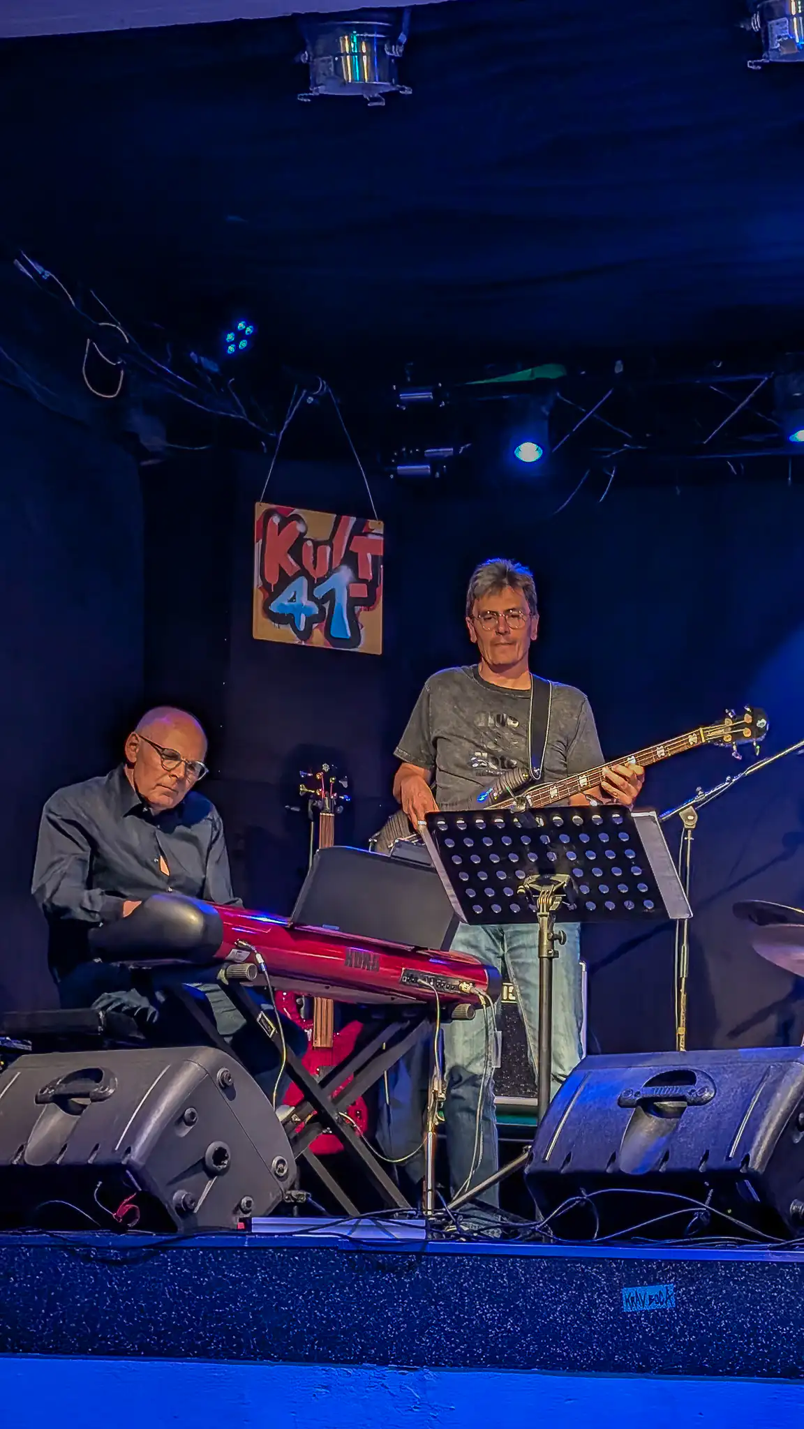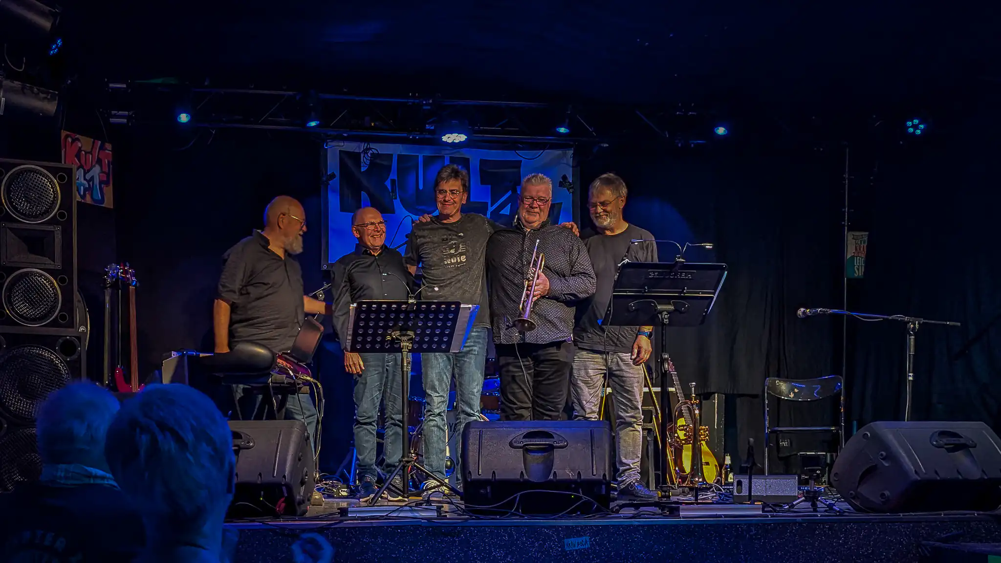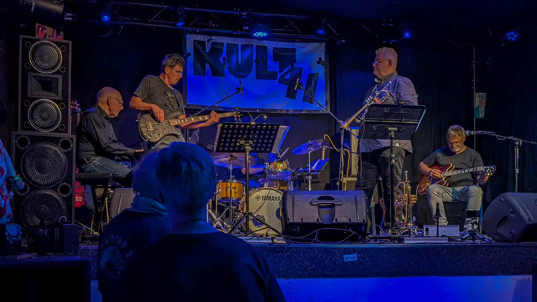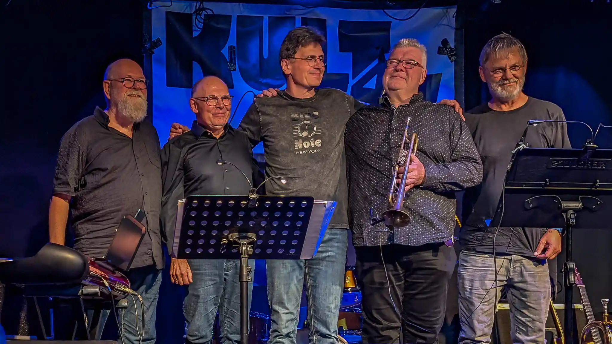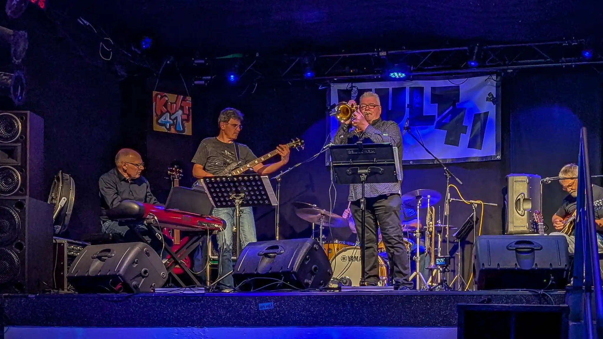 Es war eine Herausforderung, im Kult41 in Bonn zu spielen. Der Spielort mit über 200 Konzerten im Jahr(!) konzentriert sich eigentlich mehr auf Rock-, Punk- und Independent-Auftritte. Auch die Spielstätte, eine kleine Halle mit einer alten Laderampe als doch recht hoher Bühne hatte ihre akustischen Eigenheiten. Es gab einen herzlichen Empfang durch Uwe Sarter, der uns eingeladen hatte. Vor dem Konzert lud er uns erstmal Backstage zum Essen der selbstgebackenen Pizza ein. Der Soundcheck mit Wolfgang vom Kult41 hatte dann etwas Geduld abverlangt, doch beim Konzert klappte alles bestens. Das neue Programm der Band wartet neben den Swingnummern vermehrt mit erdigen Sounds aus Funk, Blues und Jazzrock auf. So legte Trompeter Rainer Matz mit Schlagzeuger Martin Christophery bei "St. Thomas" ein spektakuläres Frage-Antwortspiel hin, indem er mit seinem Mikro im "Beatbox"-Style improvisierte. Aber auch sonst gab es viele spontane Nuancen im Spiel und die den Jazzis stets eigene Spielfreude zeigte sich bei Peter Hünnemeyer in seinen virtuosen perligen Improvisationsläufen, Jörg Faust in kreativen Anschlagstechniken am Bass und Stefan Weigelt mit stets variablem Gitarrenspiel an Jazz- und Akustikgitarre wieder einmal in besonderer Weise. Der Funke sprang spätestens nach der Pause komplett über und umso schöner, dass die Jazzis die Leute zum Schluss bei den letzten vier Stücken des Konzertes sogar auf der Tanzfläche sehen konnten. Zwei Zugaben wurden noch abverlangt, bevor die ordnungsrechtliche Deadline den offiziellen Konzertabend beendete. Das Publikum und die Veranstalter konnten wir restlos begeistern und bekamen von allen Seiten positive Rückmeldungen. Eine mittelfristige Wiederholung ist fest vorgesehen. Wir bedanken uns bei Uwe für die Einladung, Wolfgang für den Sound und den netten Leuten am Einlass und an der Theke für den herzlichen Umgang und kommen natürlich gerne einmal wieder!