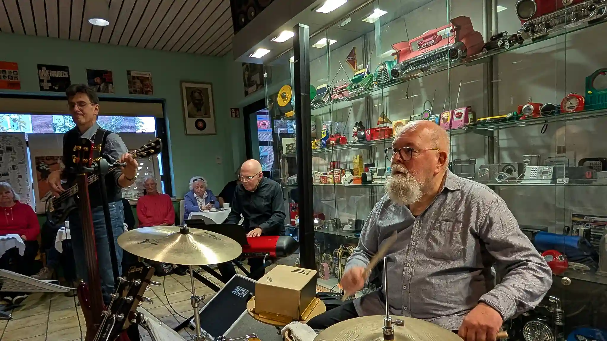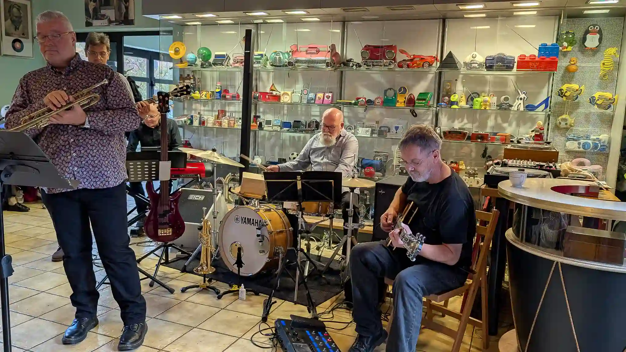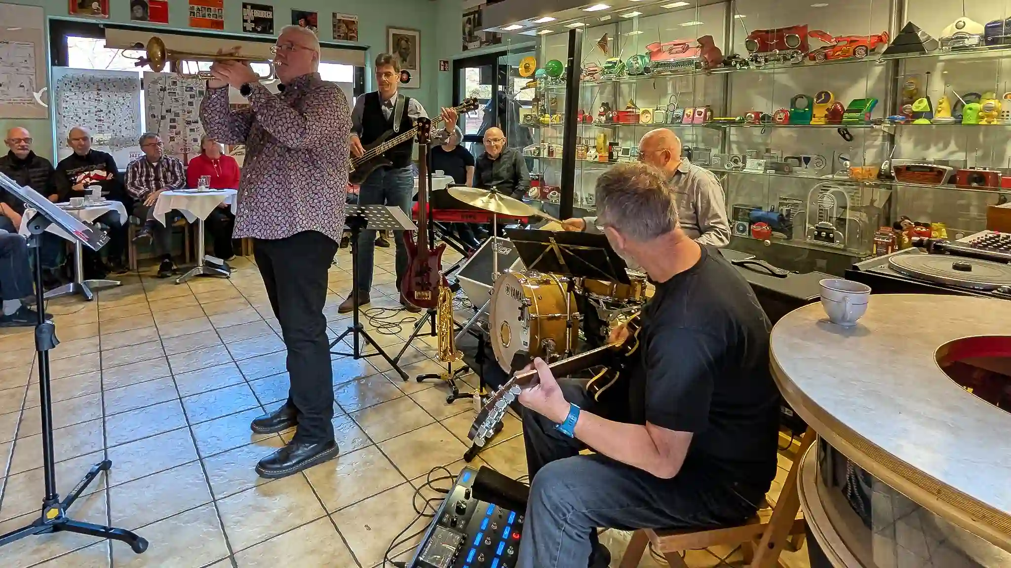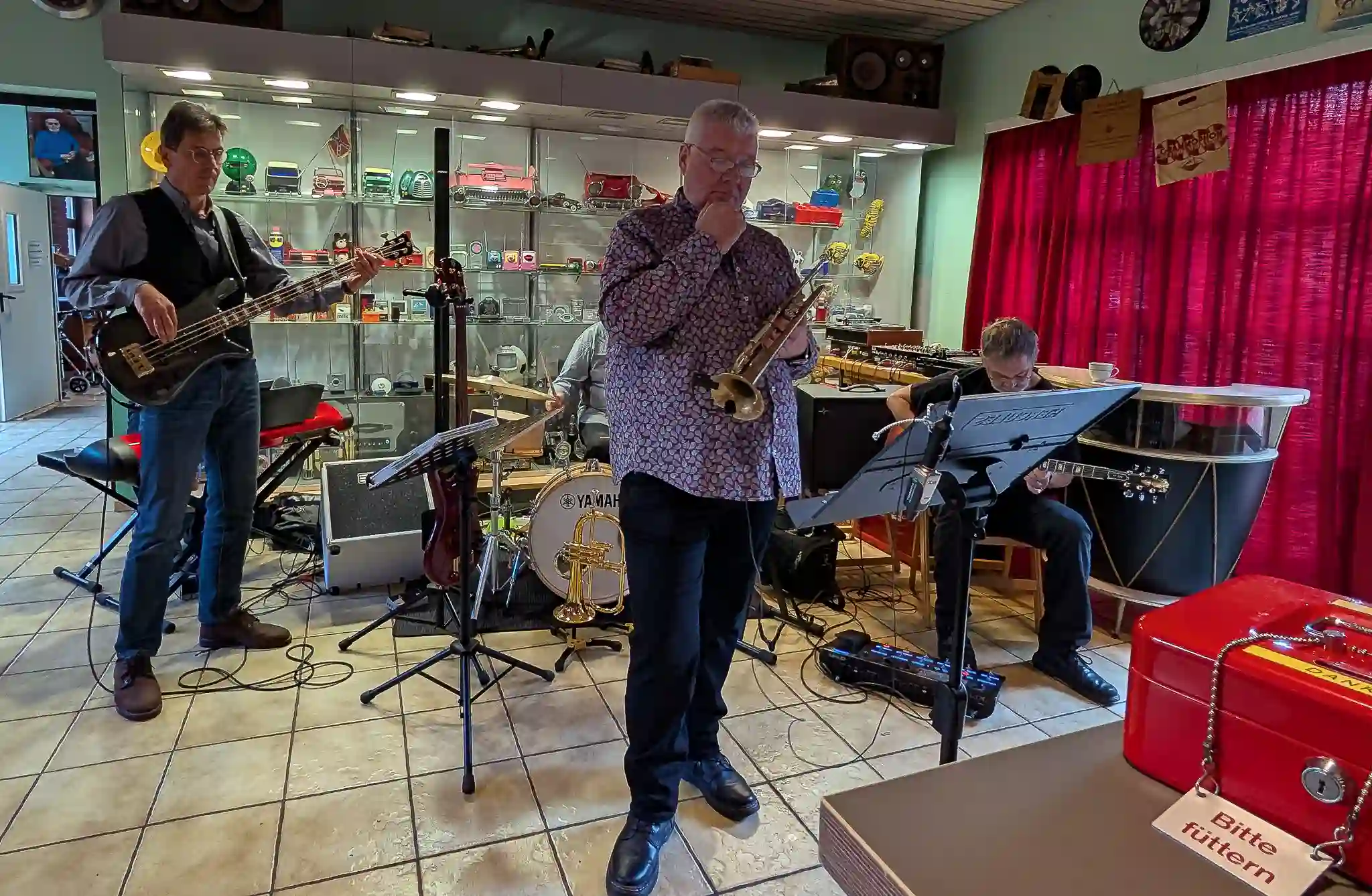Wieder mal eine tolle location, welche inhaltlich sogar mit Musik und Jazz zu tun hatte. Auf Einladung von Volkmar Hess, der umtriebigen Seele des Museums spielten die Jazzis am Sonntagnachmittag vor einem begeisterten Publikum. Da einige Swingtänzer und -tänzerinnen anwesend waren, wurde auch kräftig das Tanzbein geschwungen. Die Band hatte dazu extra für dieses event die Setlist etwas swinglastiger gestaltet. Aber auch die moderneren Stücke wurden mit viel Beifall bedacht, so besonders Bali Run, einer unserer besonders herausfordernden Titel. Es gab lecker Kuchen zu essen und natürlich war die Kulisse beeindruckend. Volkmar führte uns vor dem Auftritt durch die Sammlungen und demonstrierte vor allem ausführlich die frühe Grammofontechnik. Weitere Highlights waren die Tonbandsammlung und natürlich der DJ-Arbeitsplatz von Chris Howland, selbst ein begnadeter Musiker, der Fernseher von Werner Höfer sowie das erste EV-Mischpult von BAP. Unser Gitarrist Stefan hatte im Techniker des Museums einen kompetenten Gesprächspartner, war er doch früher selbst Sammler und Restaurateur von alten Röhrenradios. Nach dem Konzert fand noch eine kleine Fotosession vor diversen interessanten Objekten statt. Danke an alle Beteiligten des Museums und gerne kommen wir nächstes Jahr wieder.
