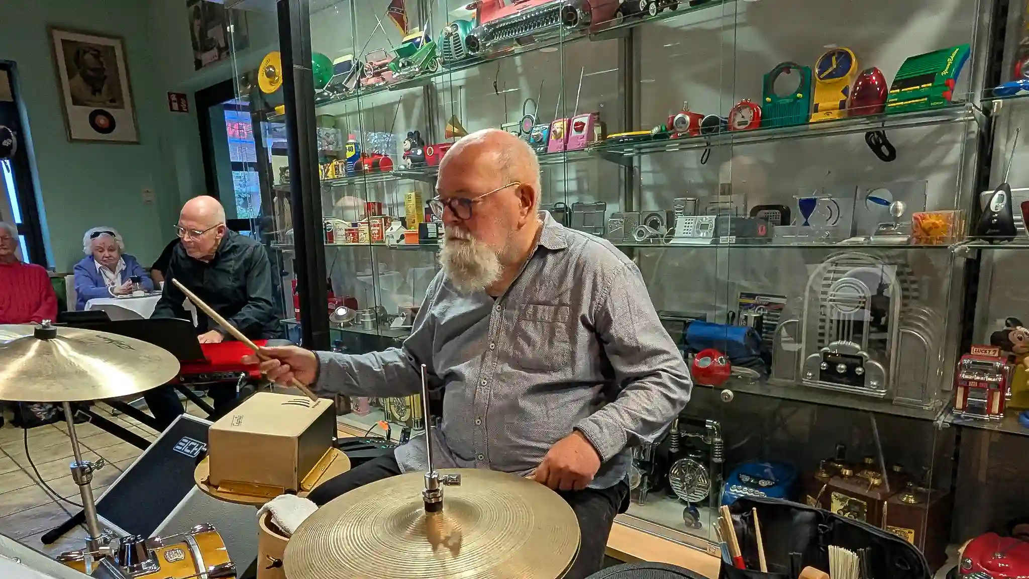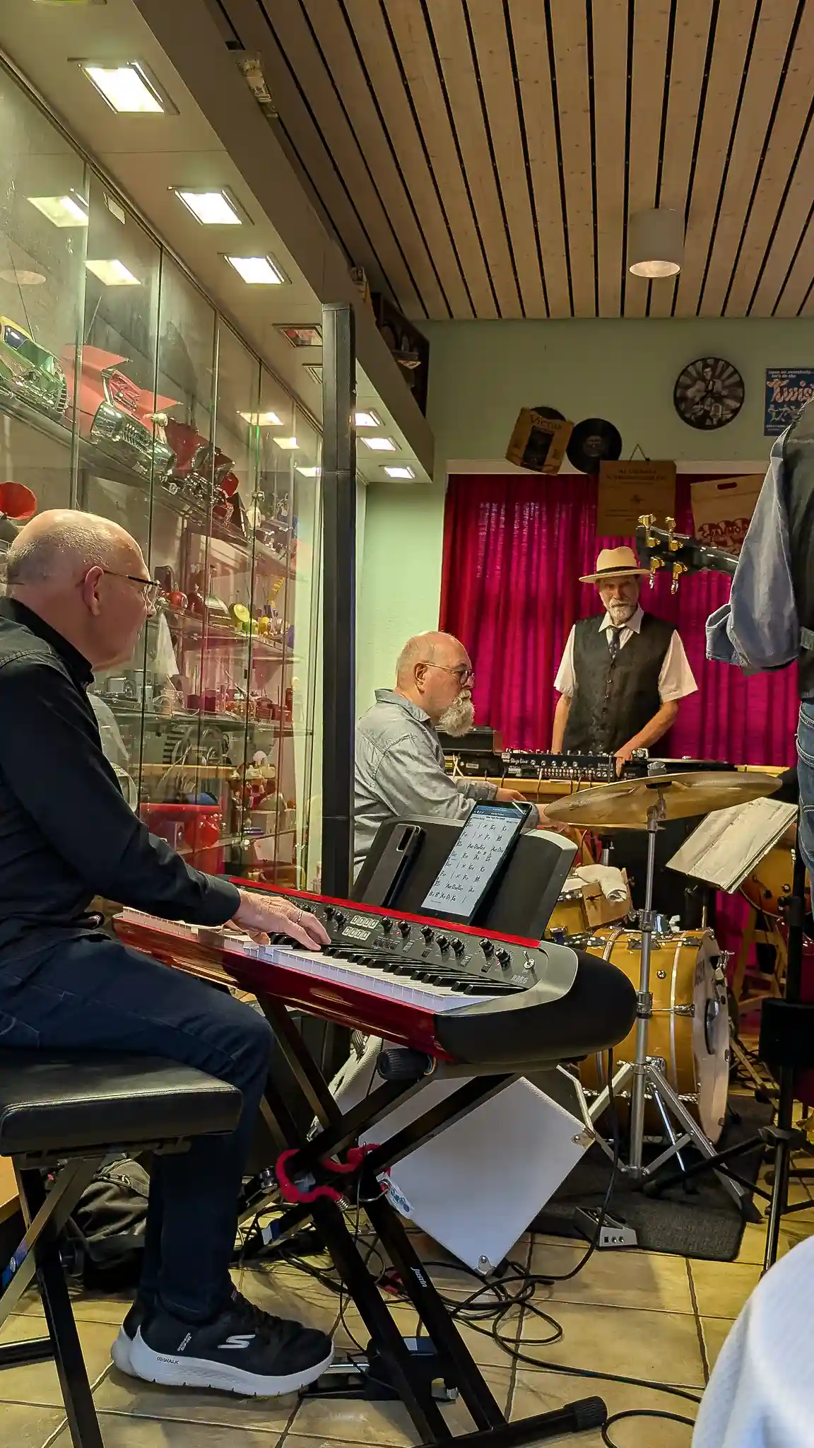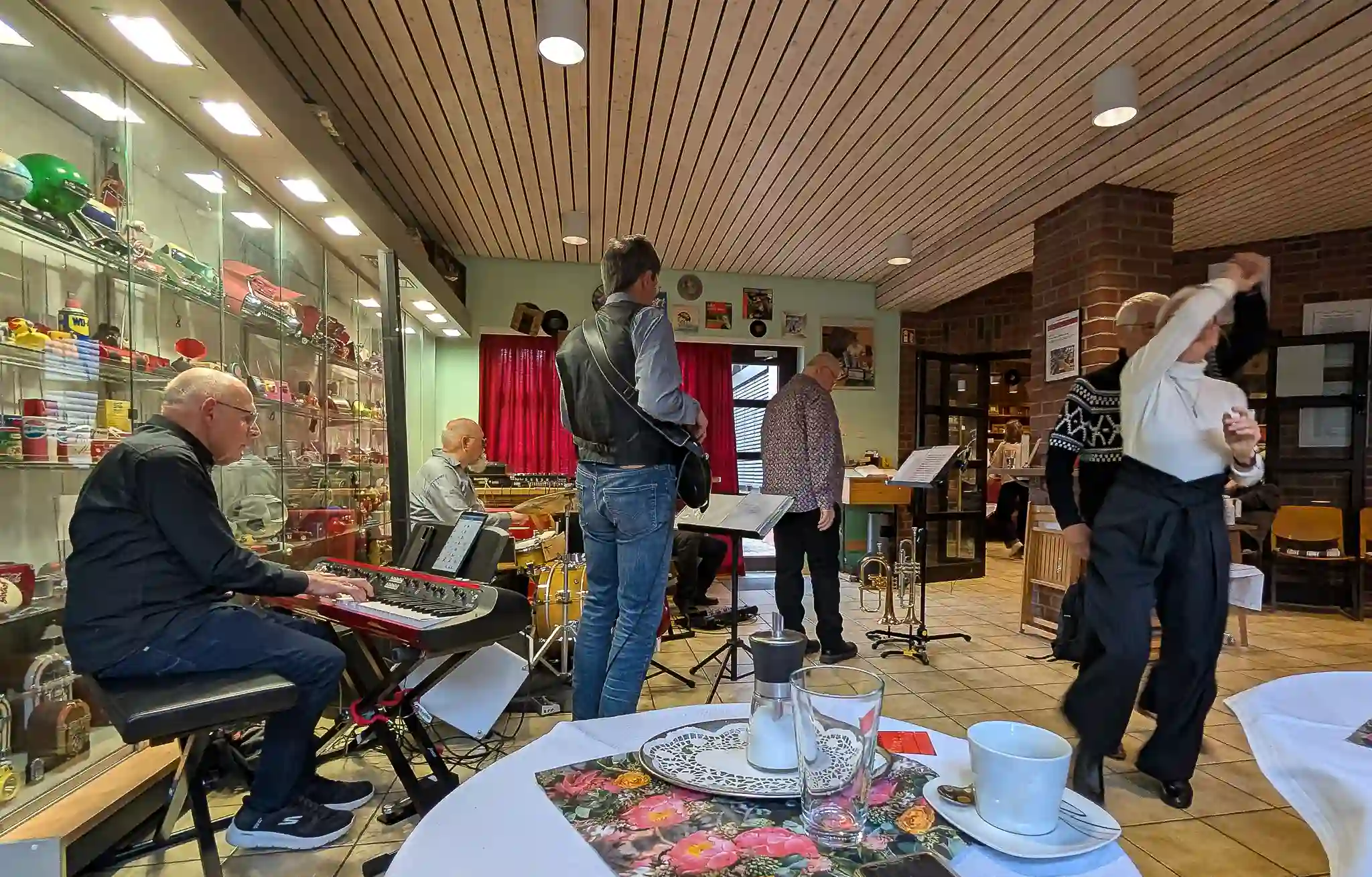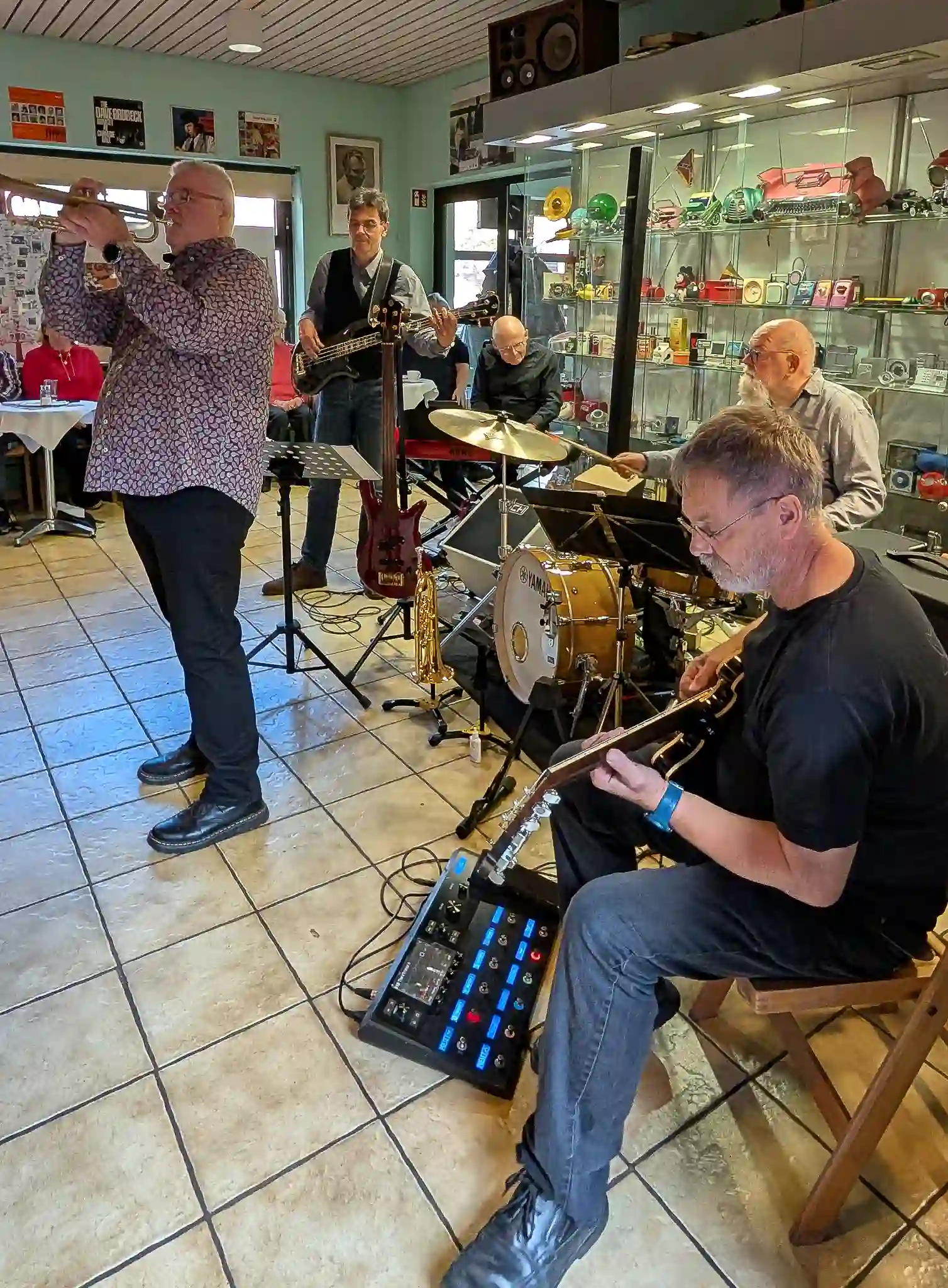 Wieder mal eine tolle location, welche inhaltlich sogar mit Musik und Jazz zu tun hatte. Auf Einladung von Volkmar Hess, der umtriebigen Seele des Museums spielten die Jazzis am Sonntagnachmittag vor einem begeisterten Publikum. Da einige Swingtänzer und -tänzerinnen anwesend waren, wurde auch kräftig das Tanzbein geschwungen. Die Band hatte dazu extra für dieses event die Setlist etwas swinglastiger gestaltet. Aber auch die moderneren Stücke wurden mit viel Beifall bedacht, so besonders Bali Run, einer unserer besonders herausfordernden Titel. Es gab lecker Kuchen zu essen und natürlich war die Kulisse beeindruckend. Volkmar führte uns vor dem Auftritt durch die Sammlungen und demonstrierte vor allem ausführlich die frühe Grammofontechnik. Weitere Highlights waren die Tonbandsammlung und natürlich der DJ-Arbeitsplatz von Chris Howland, selbst ein begnadeter Musiker, der Fernseher von Werner Höfer sowie das erste EV-Mischpult von BAP. Unser Gitarrist Stefan hatte im Techniker des Museums einen kompetenten Gesprächspartner, war er doch früher selbst Sammler und Restaurateur von alten Röhrenradios. Nach dem Konzert fand noch eine kleine Fotosession vor diversen interessanten Objekten statt. Danke an alle Beteiligten des Museums und gerne kommen wir nächstes Jahr wieder.