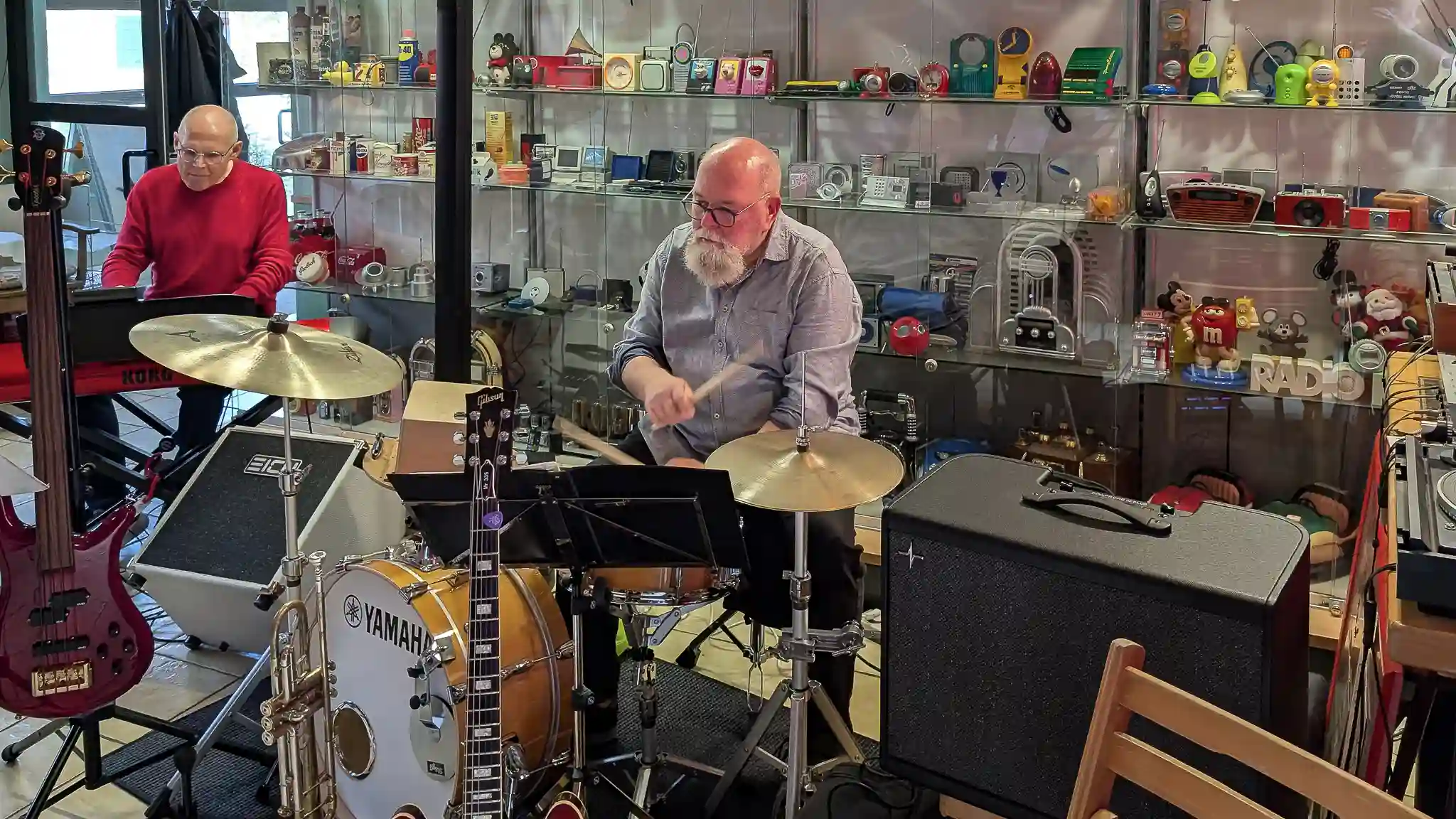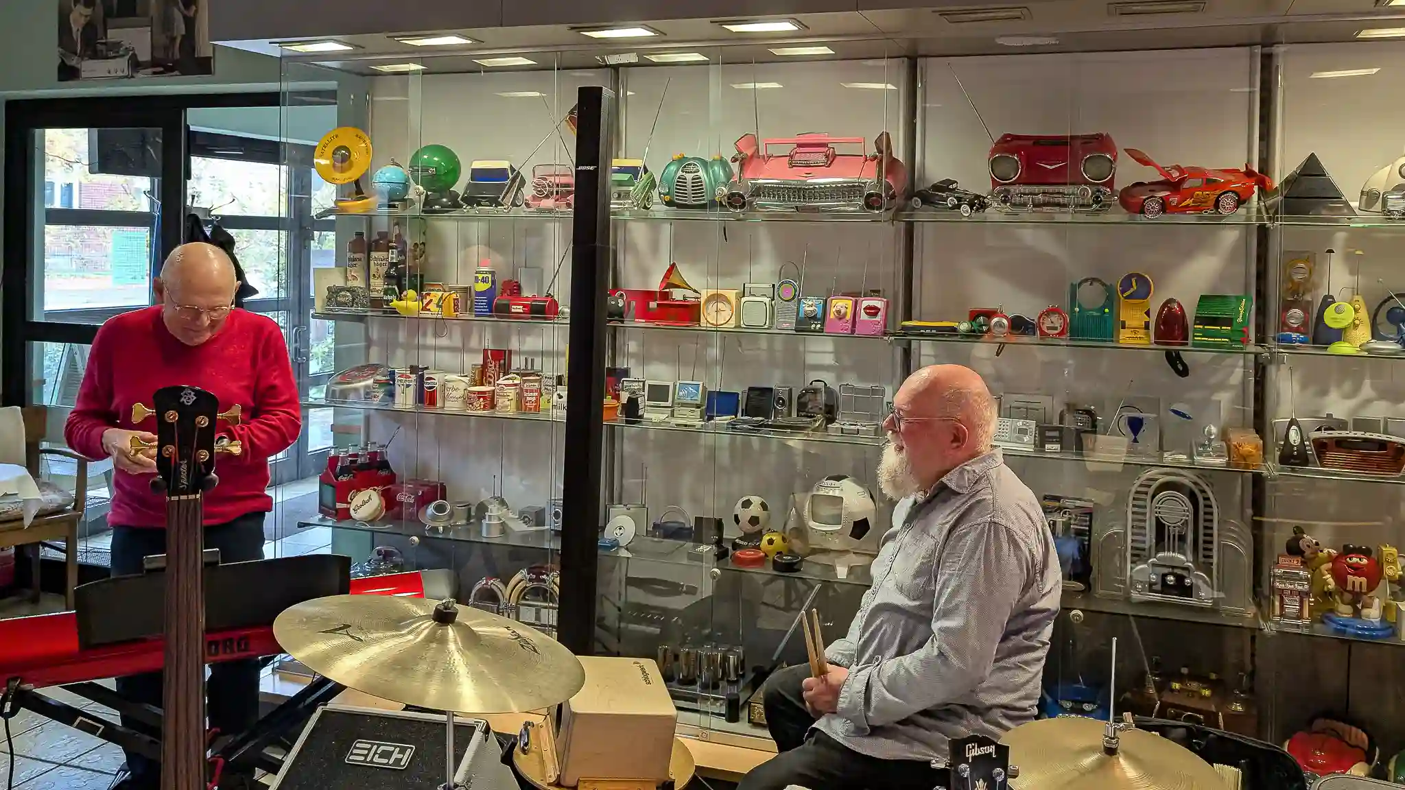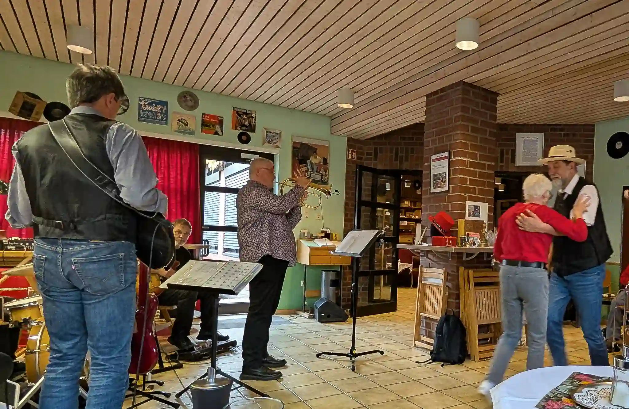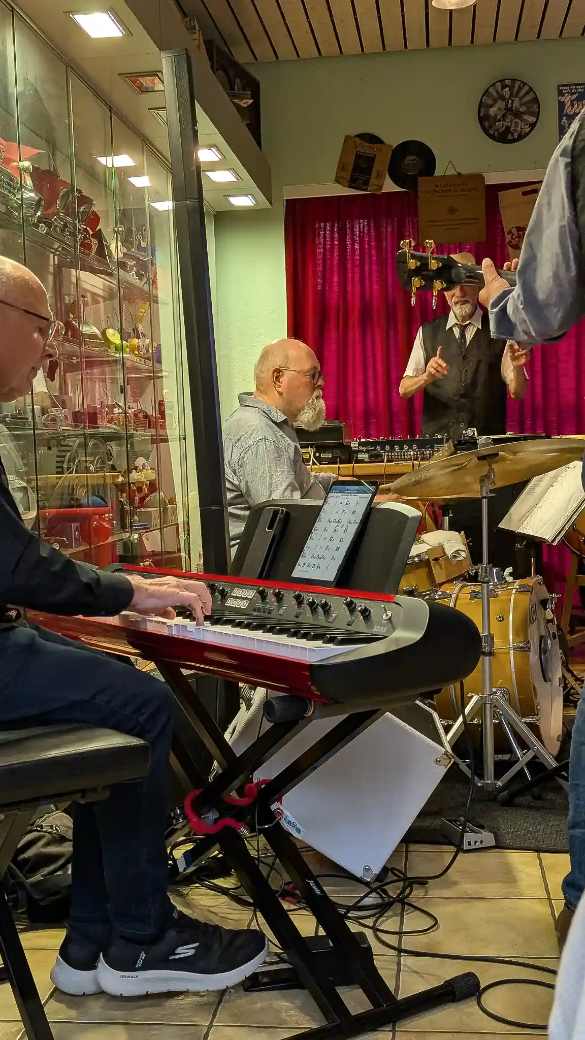 Wieder mal eine tolle location, welche inhaltlich sogar mit Musik und Jazz zu tun hatte. Auf Einladung von Volkmar Hess, der umtriebigen Seele des Museums spielten die Jazzis am Sonntagnachmittag vor einem begeisterten Publikum. Da einige Swingtänzer und -tänzerinnen anwesend waren, wurde auch kräftig das Tanzbein geschwungen. Die Band hatte dazu extra für dieses event die Setlist etwas swinglastiger gestaltet. Aber auch die moderneren Stücke wurden mit viel Beifall bedacht, so besonders Bali Run, einer unserer besonders herausfordernden Titel. Es gab lecker Kuchen zu essen und natürlich war die Kulisse beeindruckend. Volkmar führte uns vor dem Auftritt durch die Sammlungen und demonstrierte vor allem ausführlich die frühe Grammofontechnik. Weitere Highlights waren die Tonbandsammlung und natürlich der DJ-Arbeitsplatz von Chris Howland, selbst ein begnadeter Musiker, der Fernseher von Werner Höfer sowie das erste EV-Mischpult von BAP. Unser Gitarrist Stefan hatte im Techniker des Museums einen kompetenten Gesprächspartner, war er doch früher selbst Sammler und Restaurateur von alten Röhrenradios. Nach dem Konzert fand noch eine kleine Fotosession vor diversen interessanten Objekten statt. Danke an alle Beteiligten des Museums und gerne kommen wir nächstes Jahr wieder.