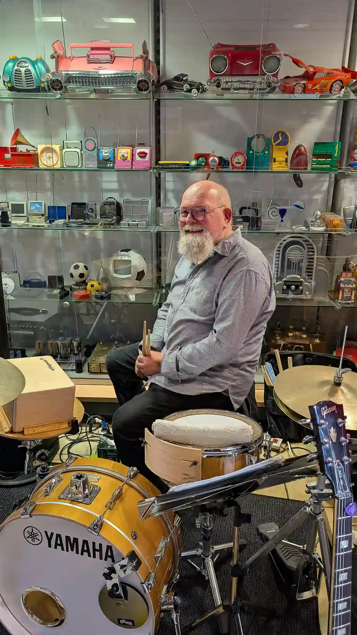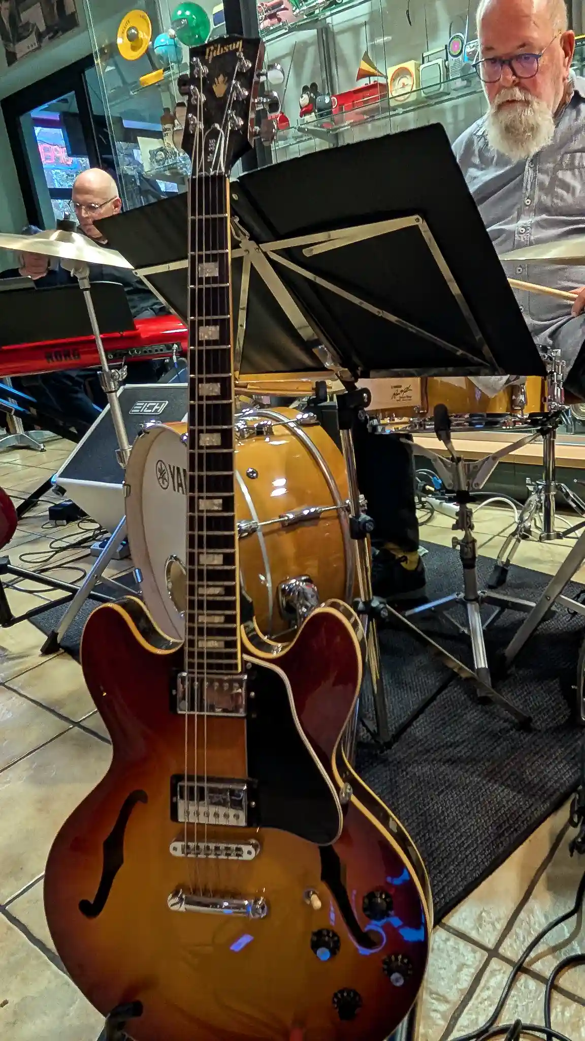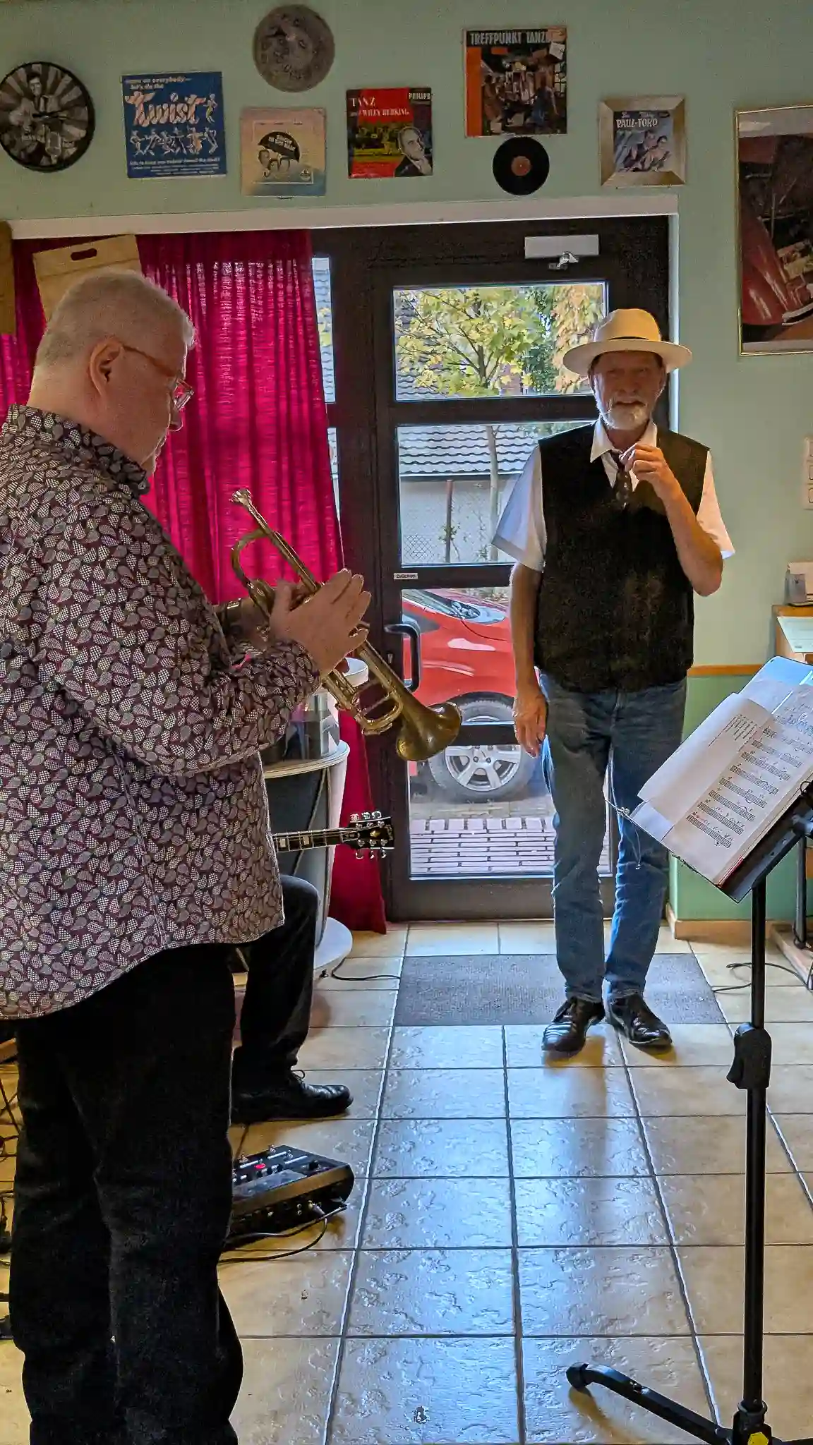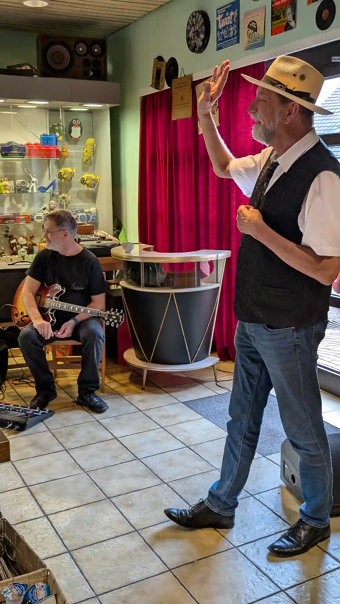 Wieder mal eine tolle location, welche inhaltlich sogar mit Musik und Jazz zu tun hatte. Auf Einladung von Volkmar Hess, der umtriebigen Seele des Museums spielten die Jazzis am Sonntagnachmittag vor einem begeisterten Publikum. Da einige Swingtänzer und -tänzerinnen anwesend waren, wurde auch kräftig das Tanzbein geschwungen. Die Band hatte dazu extra für dieses event die Setlist etwas swinglastiger gestaltet. Aber auch die moderneren Stücke wurden mit viel Beifall bedacht, so besonders Bali Run, einer unserer besonders herausfordernden Titel. Es gab lecker Kuchen zu essen und natürlich war die Kulisse beeindruckend. Volkmar führte uns vor dem Auftritt durch die Sammlungen und demonstrierte vor allem ausführlich die frühe Grammofontechnik. Weitere Highlights waren die Tonbandsammlung und natürlich der DJ-Arbeitsplatz von Chris Howland, selbst ein begnadeter Musiker, der Fernseher von Werner Höfer sowie das erste EV-Mischpult von BAP. Unser Gitarrist Stefan hatte im Techniker des Museums einen kompetenten Gesprächspartner, war er doch früher selbst Sammler und Restaurateur von alten Röhrenradios. Nach dem Konzert fand noch eine kleine Fotosession vor diversen interessanten Objekten statt. Danke an alle Beteiligten des Museums und gerne kommen wir nächstes Jahr wieder.